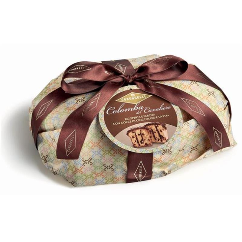 Colomba artigianale a lenta lievitazione farcita con crema al cioccolato e uvette, ricoperta di cioccolato fondente e incartata a mano