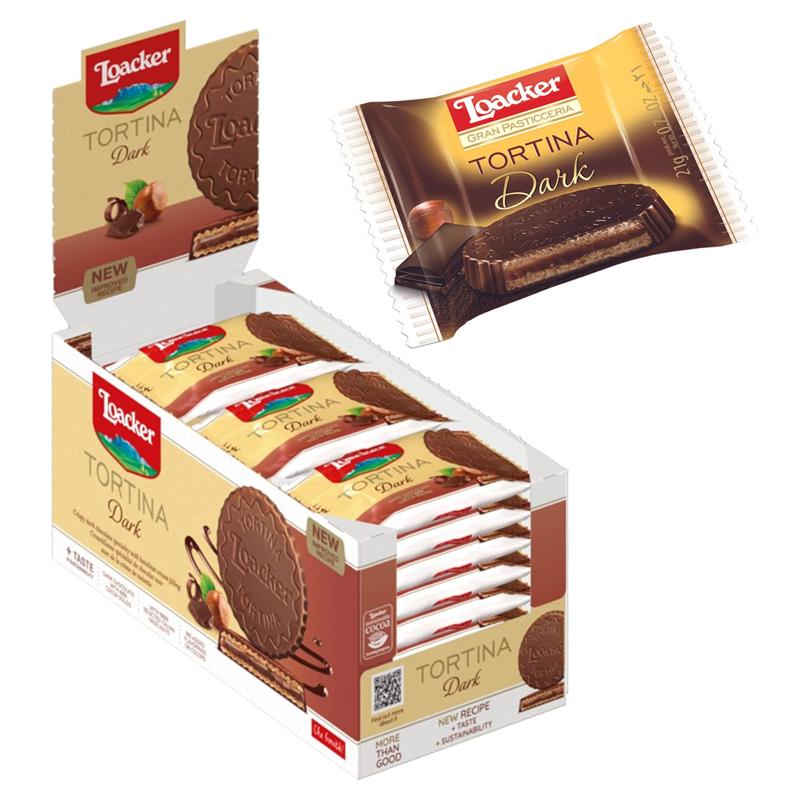 Loacker Gran Pasticceria TortinaDark Una Vera Delizia , Bastera' Un Assaggio E La Sua Armonia Vi Deliziera' : Prima La Fine Copertura Di CioccolatoFondente&Nbsp;, Poi Le Due Sottili Cialde Di Wafer E Infine Il Cuore Di Crema Alle Nocciole.