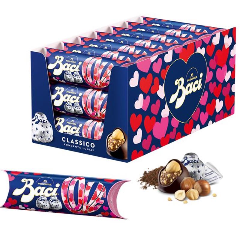 raggiunge l’apice della croccantezza con la nocciola intera ed è avvolto dalla doppia copertura di pregiato cioccolato fondente Luisa.