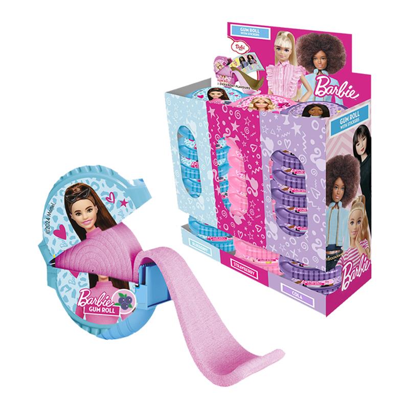 Barbie Gum Roll bubble gum arrotolata gusti assortiti fragola, cola, lampone. Ogni dipencer di bubble gum dal peso di 15g in un display da pz 24 contiene degli adesivi Stickers a tema Barbie.