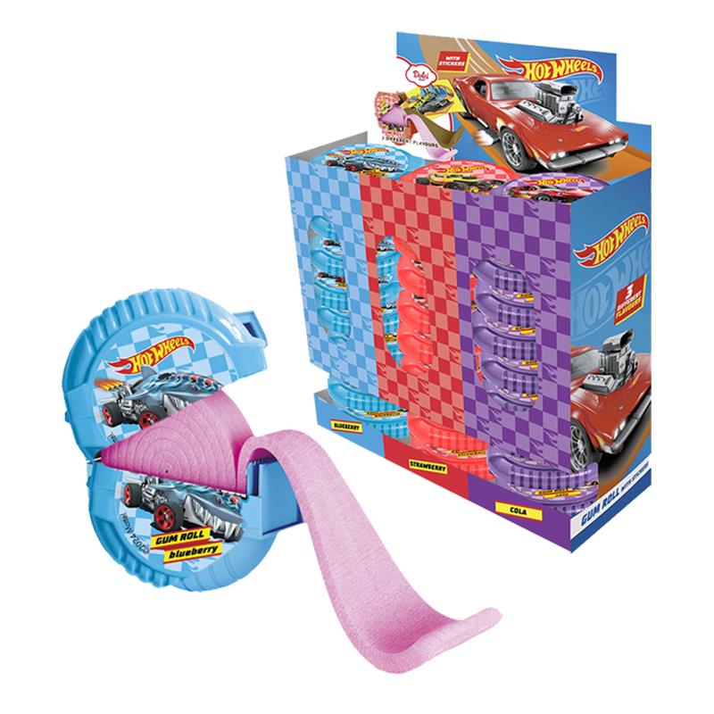 Bubble gum roll gusti assortiti fragola, mirtillo, cola, mela verde. Espositore da banco 24 pezzi, peso singolo dipenser bubble gum roll 15g.