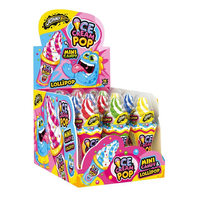 Lecca lecca espositore a forma di coni gelato ai gusti fragola, mela, lamponecon caramelline alla fruttaArticoli per bambini, candy toys, articoli per feste e party