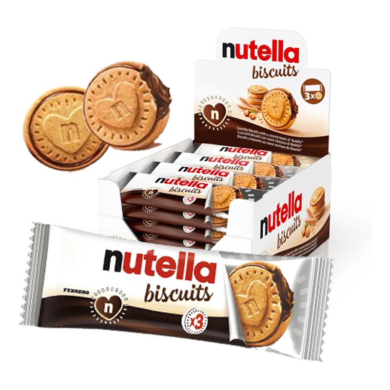 Nutella Biscuits Ferrero: fragranti biscotti di pasta frolla dorata con un cuore cremoso di autentica Nutella. Perfetti per una pausa golosa o per condividere momenti speciali.