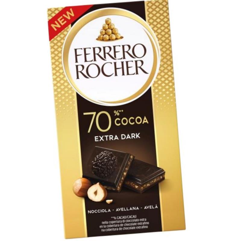 Finissima tavoletta di cioccolato Ferrero Rocher al gusto di cioccolato fondente al 70% e nocciole tritate