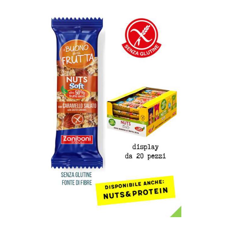 Barretta di consistenza morbida di frutta secca (54% arachidi e mandorle) e cereali con zucchero come agente legante, arricchito con pezzi di caramello salato (8%).
